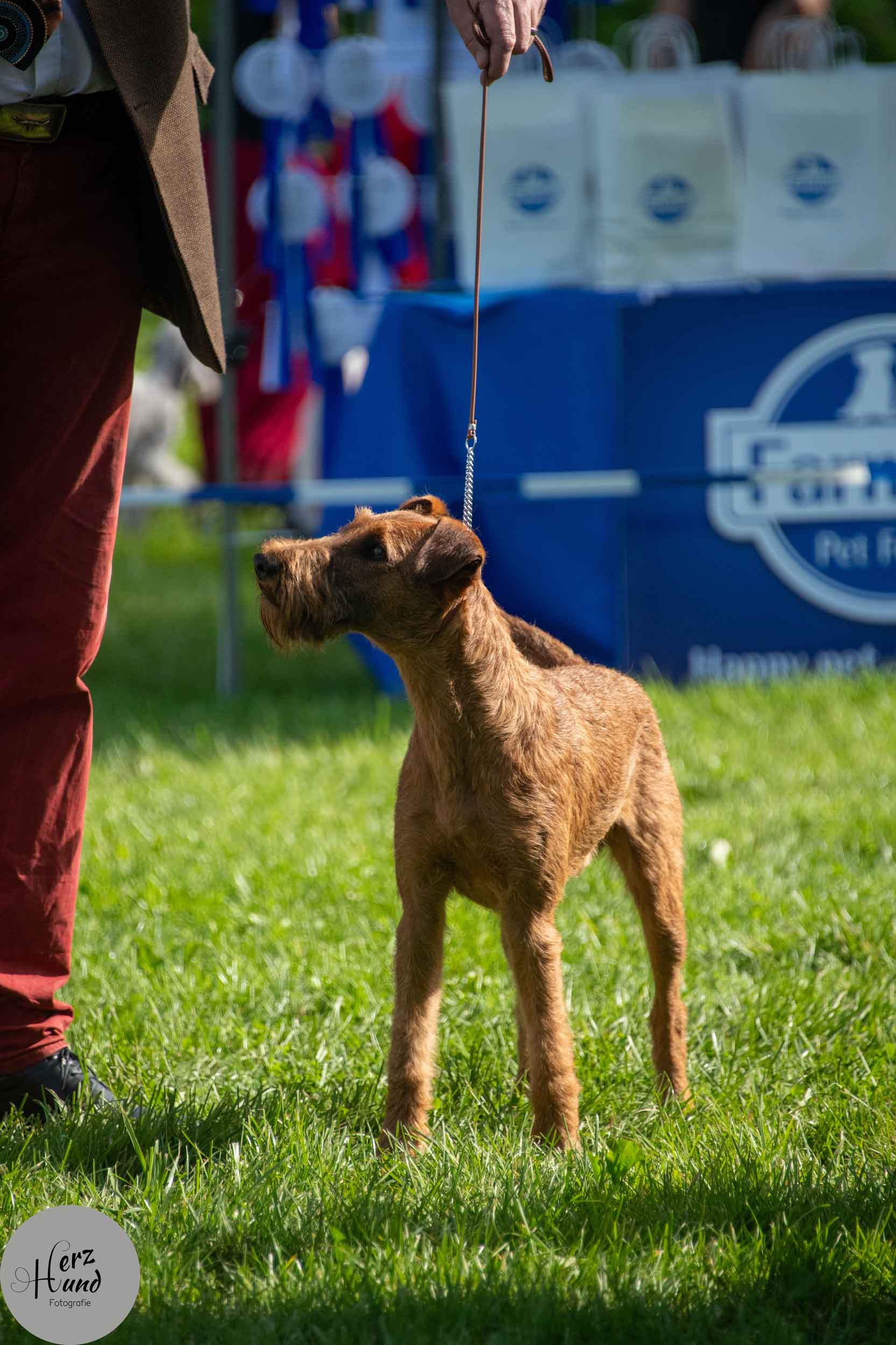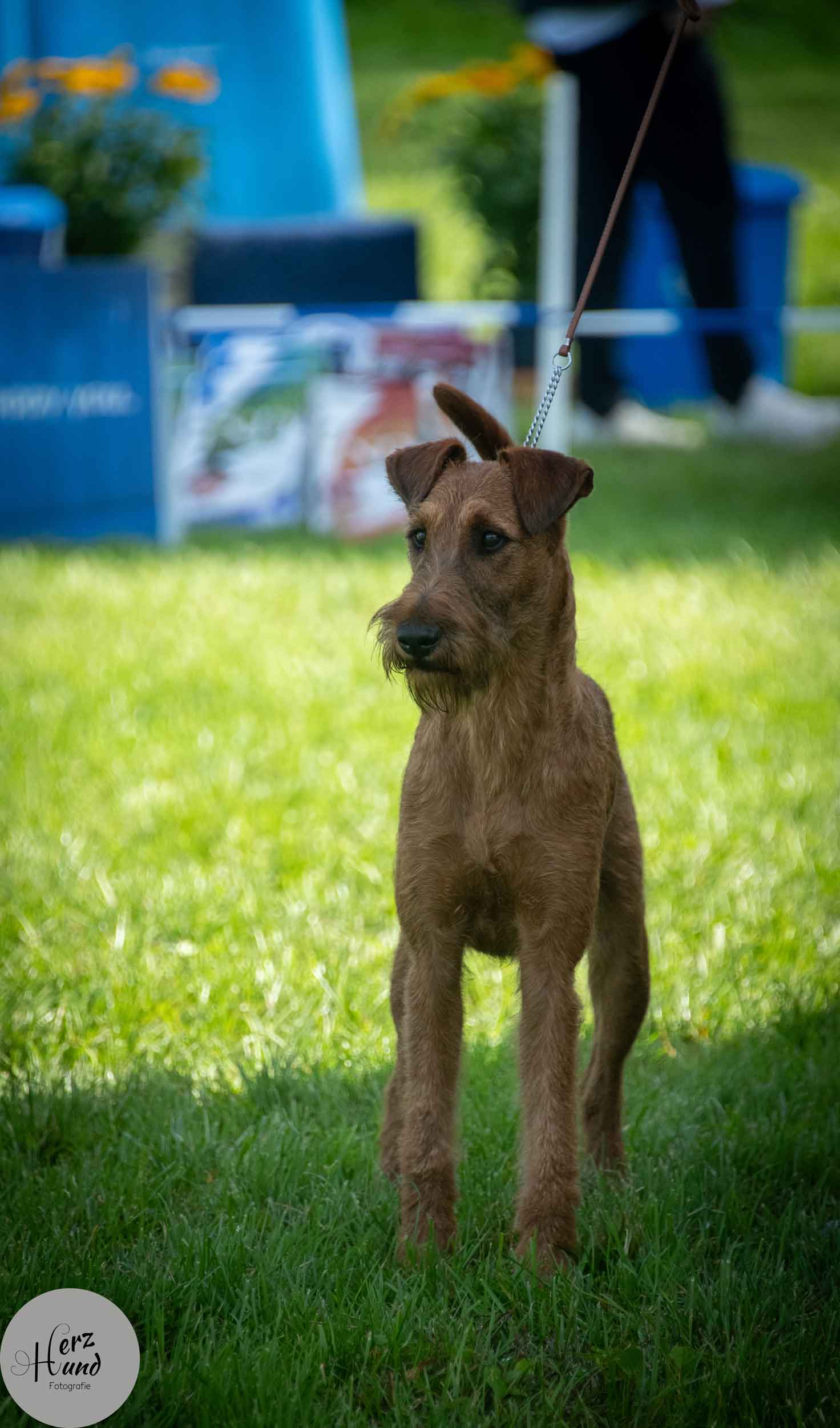 Er ist ein sehr roter Irish mit hervorragendem, harschem Fell. Linien und Winkelungen stimmen. Er läuft mit viel Schub und liebt es, sich im Ring zu präsentieren und den Mädels schöne Augen zu machen. Niemand kann sich seinem Charme entziehen; das gilt auch für uns Menschen. Dabei ist er sehr maskulin mit dem entsprechenden Auftreten. Trotzdem ist er gut handlebar und versteht sich mit den meisten anderen Hunden. Er liebt ausgiebige Kuscheleinheiten, seine tägliche Futterbeutelsuche, wildes Spiel mit Lütte und Niamh, Trainingseinheiten auf dem Hundeplatz und lange Spaziergänge - am liebsten am Strand.